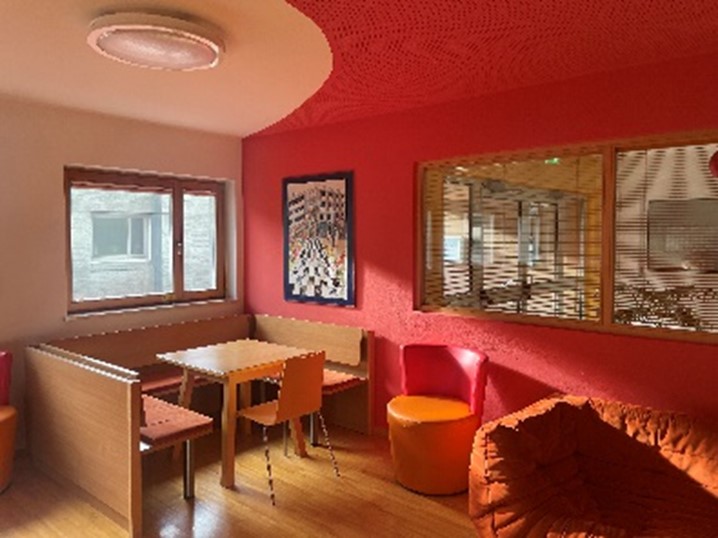 In jedem Stock gibt es einen gemütlichen Aufenthaltsraum mit Sitzgelegenheiten, einen Fernseher, eine kleine Kochnische mit Wasserkocher und Kühlschrank.
